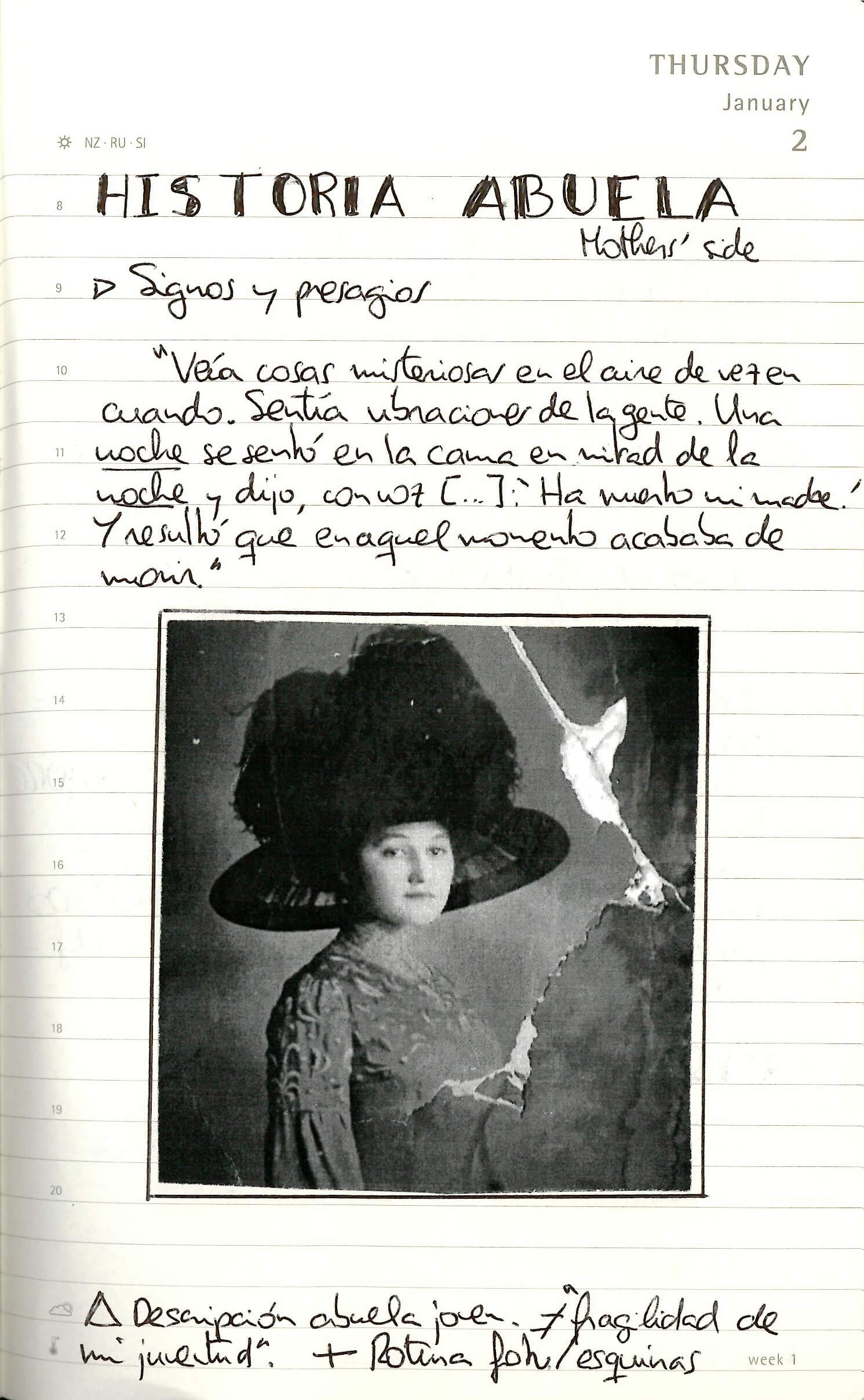 El nacimiento de Nana me parece un buen momento para empezar esta línea del tiempo. De hecho, su historia es la primera nota que tomé en mi Moleskine y, en ella, podéis ver la cicatriz que más tarde describirá Don. Por mucho que he intentado descifrar el origen de la instantánea, no lo he logrado, la verdad. Es uno de aquellos datos que pierdo y que, a pesar de la rabia que me genera, no soy capaz de recuperar ni con una búsqueda en internet. Aquí tenéis la foto original que tomé con el teléfono (de un libro, una revista, quién lo sabe…) y la captura de la primera página de mis notas para la novela.