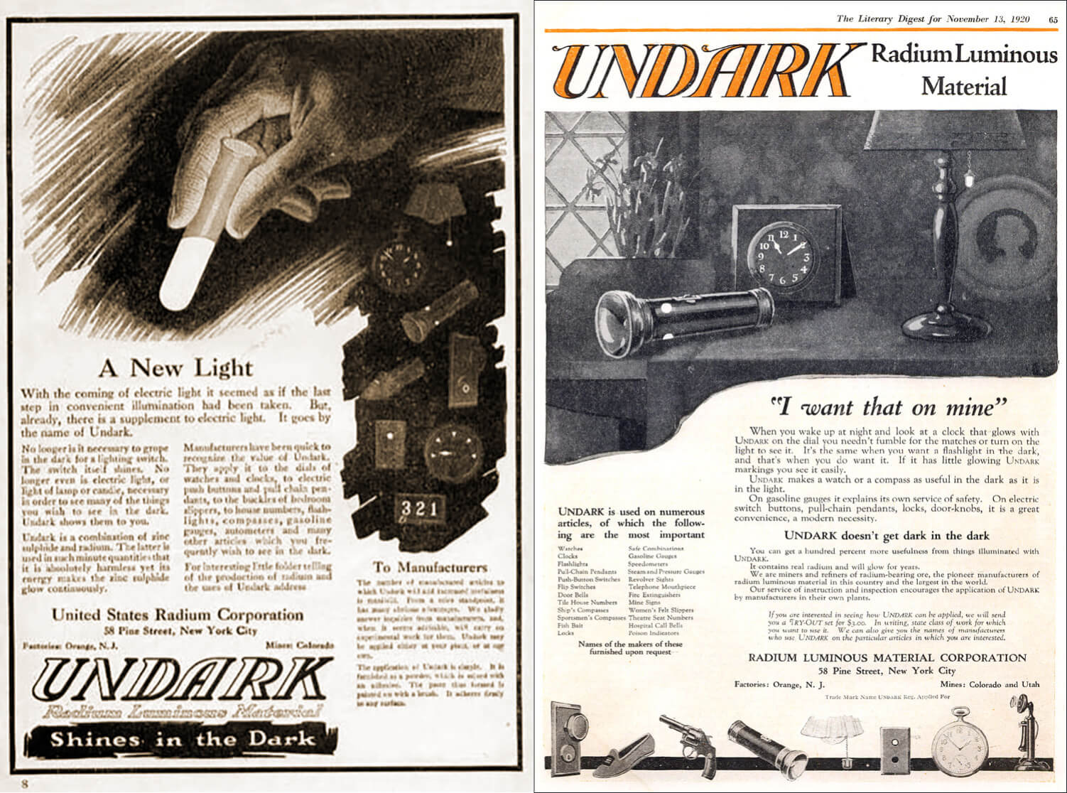 A pesar del caso de Grace Fryer, que fue en los años 20, lo único que cambió para la compañía fue que movieron su sede, pero siguieron pintando esferas de la misma forma en que lo hacían antes, sin importarles la salud de sus empleadas. Aquí abajo, podéis ver un par de anuncios del Undark , que era el nombre comercial de la pintura que usaban y una foto de cómo se chupaban los pinceles con radio para más precisión.