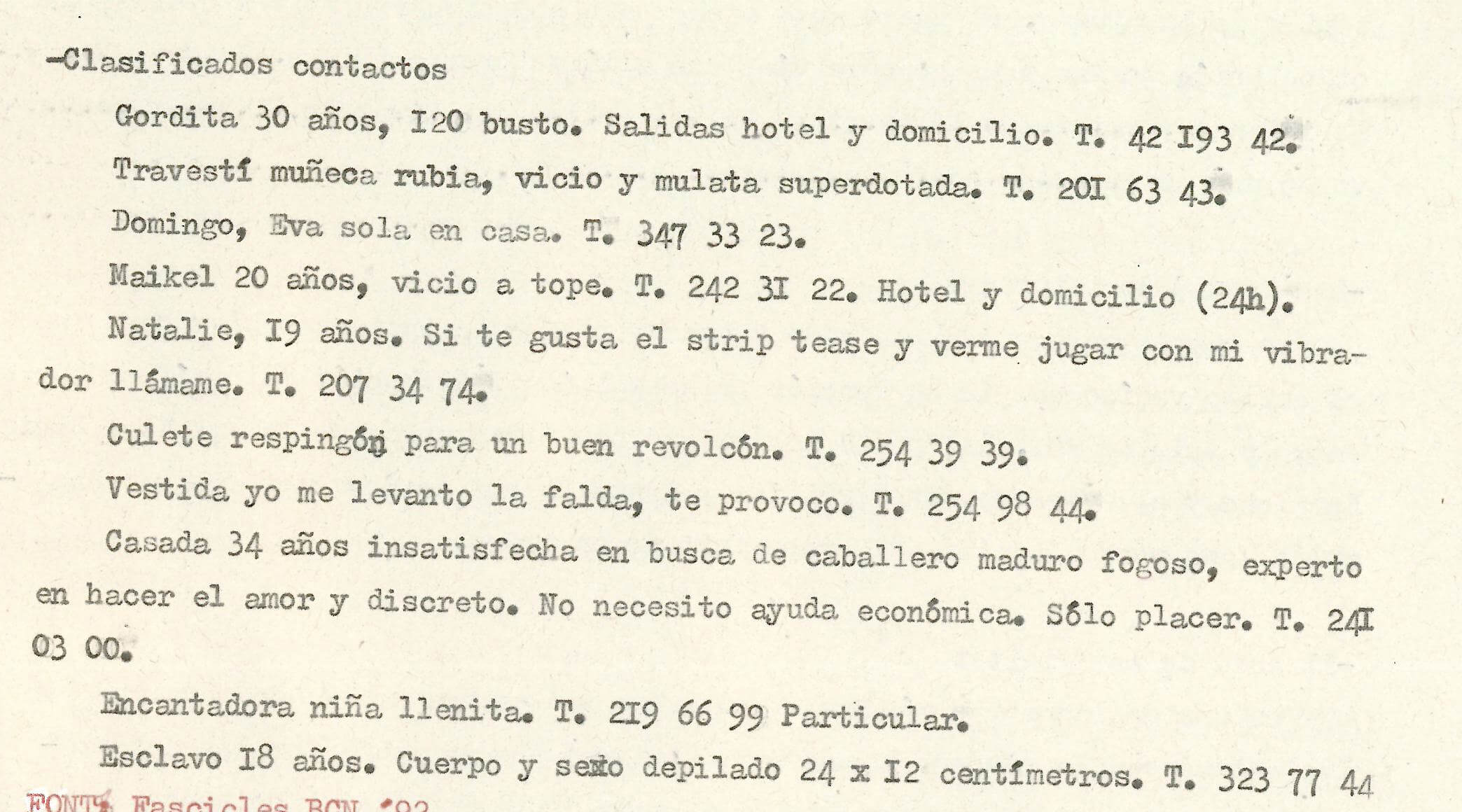 Otra cosa para la que quería utilizar Barcelona, pero que luego se cayó de la novela, era el machismo de Seiki, que llevaba a Don de putas. Para ello, recopilé estos clasificados de un periódico de la época. Son un documento interesante y creo que merece la pena ponerlo aquí aunque finalmente no estén en la novela.